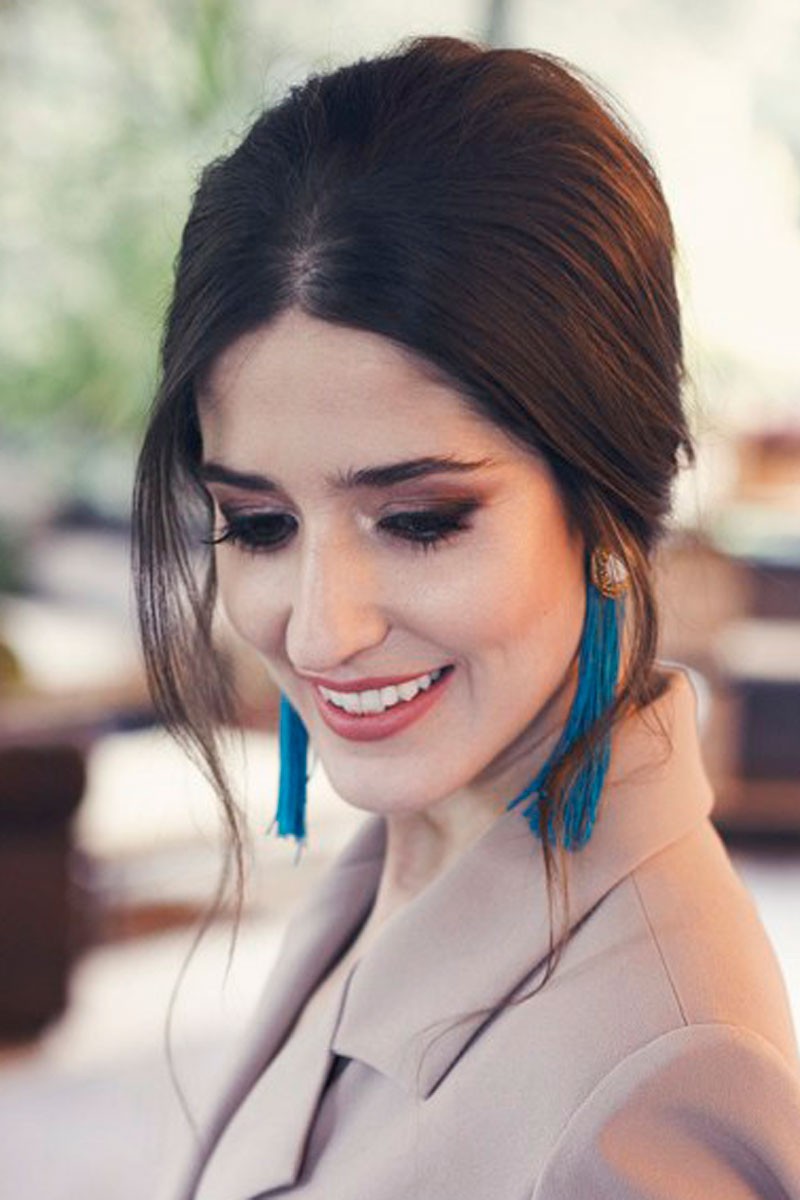Pendientes en forma de círculo blanco con reborde dorado con pequeños dibujos. Flecos en color verde agua. (...)