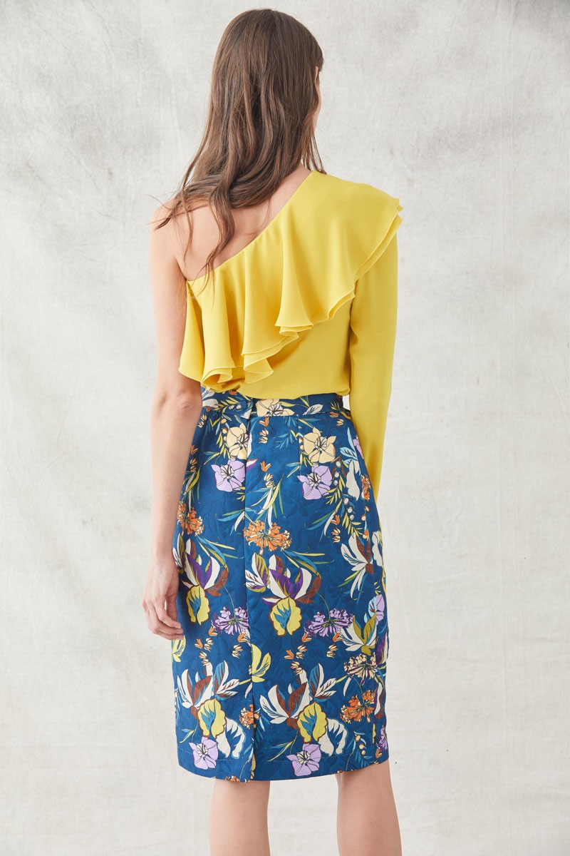 Top de escote asimétrico confeccionado en un tejido de crepe fino de color mostaza. Volante al rededor de todo el escote y la espalda. Forro interior y cierre con cremallera al tono en el (...)