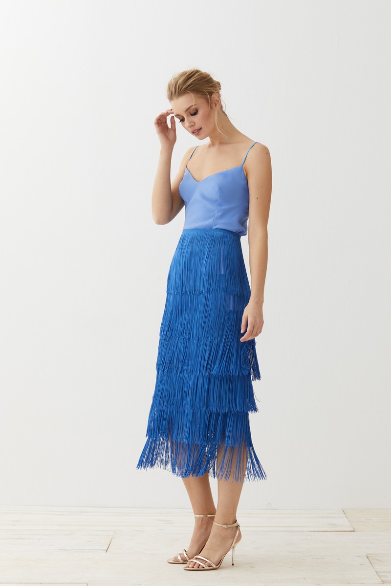 Preciosa Falda de Flecos en color azul de corte midi. Una maravillosa falda entubada cuya base está confeccionada en crepe de color azul y en la que destacan los flecos de algodón.