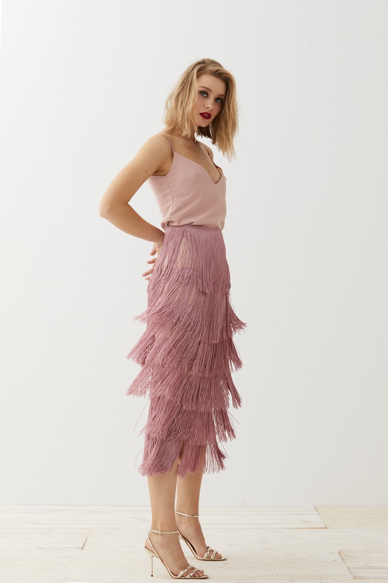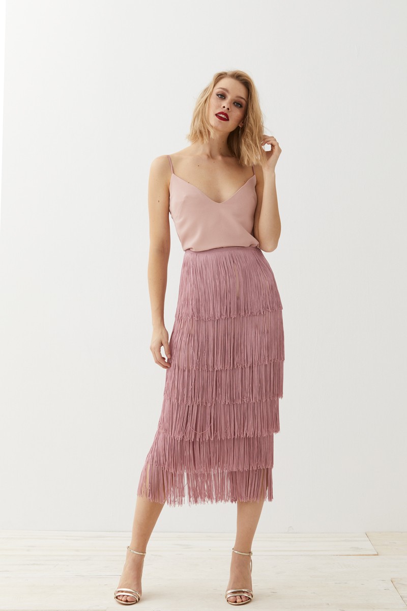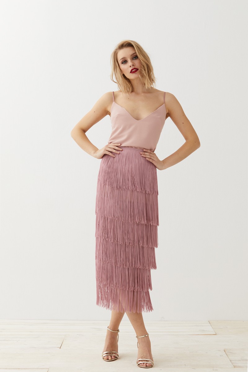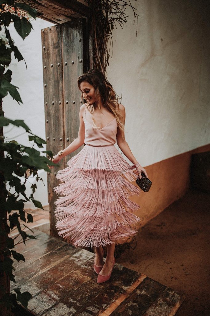 Pink fringed skirt. Ideal set for wedding guests, communions, baptisms, graduations and parties Handmade in Spain Shipped wordwide Composición: 100% poliéster