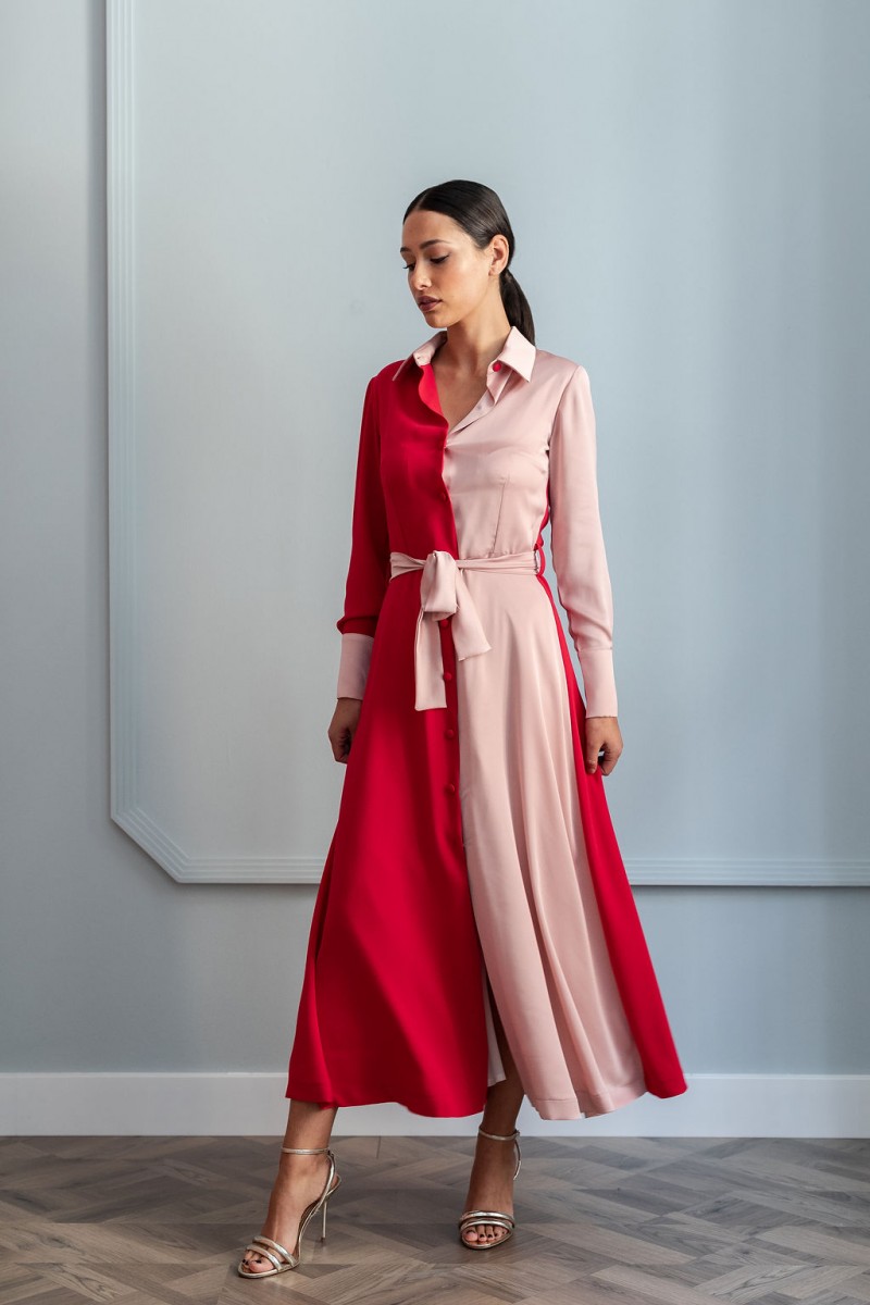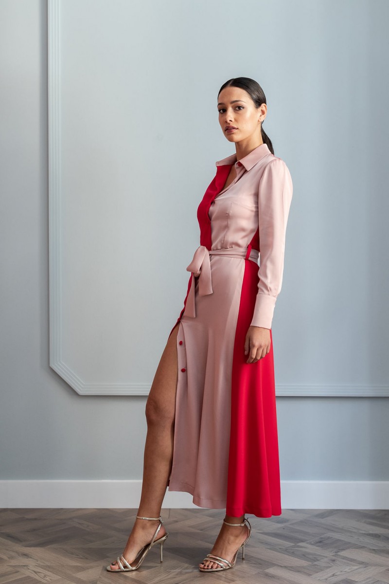 Destaca el precioso binomio de color que conjuga el vestido rojo y rosa en el que además destacan las solapas del cuello en el satén rosa brillante, así como los puños con doble botonadura y el cinturón también en ese mismo tono rosa empolvado satenado.