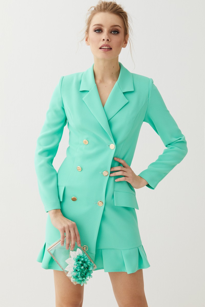 Vestido corto tipo esmoquin confeccionado en tejido de crepe de alta calidad en color aguamarina. Corte entallado que estiliza y favorece la figura femenina. Un precioso vestido, que destaca por su forma de chaqueta americana con el escote en pico y cuello con solapa de manga larga y un volante al final de la falda a la altura de la cadera, que le otorga un bello moviento al caminar.