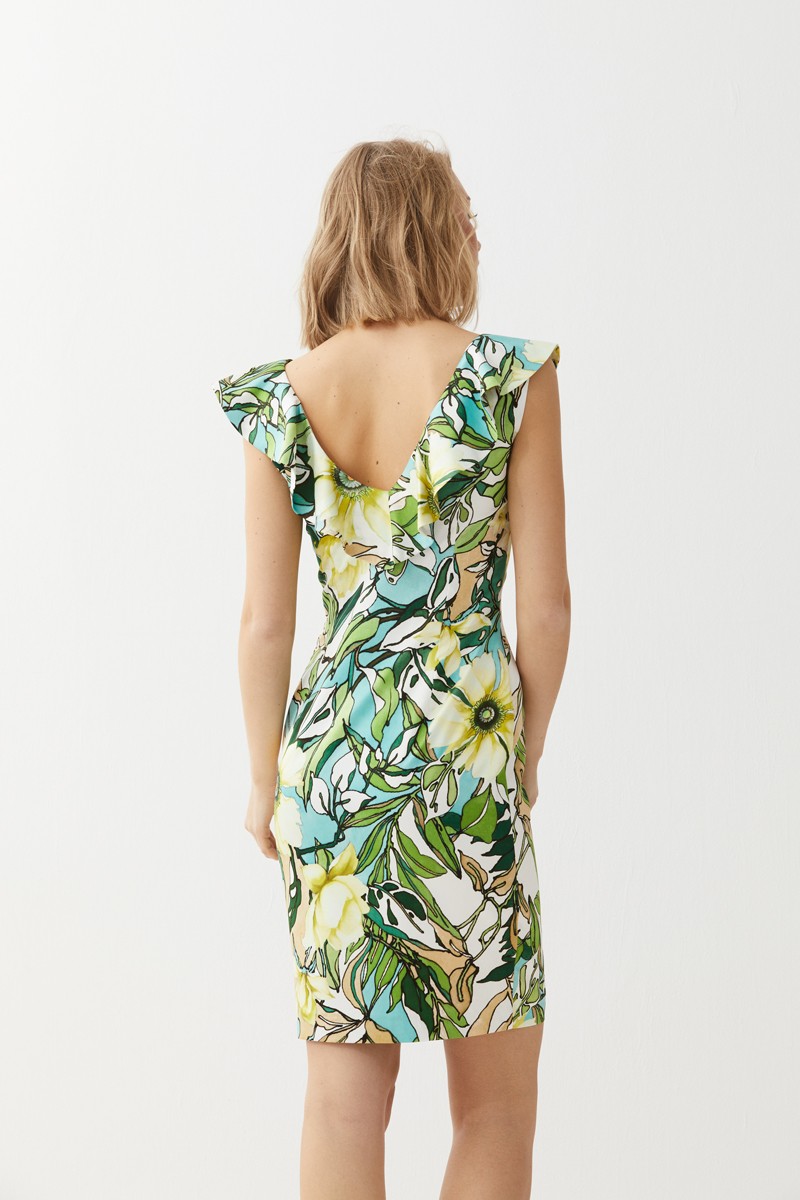 Vestido corto abotonado, con cierre de ocho preciosos botones dorados en la parte delantera y bonito escote en pico por delante y por detrás sobre el que cae un delicado volante tanto en el (...)