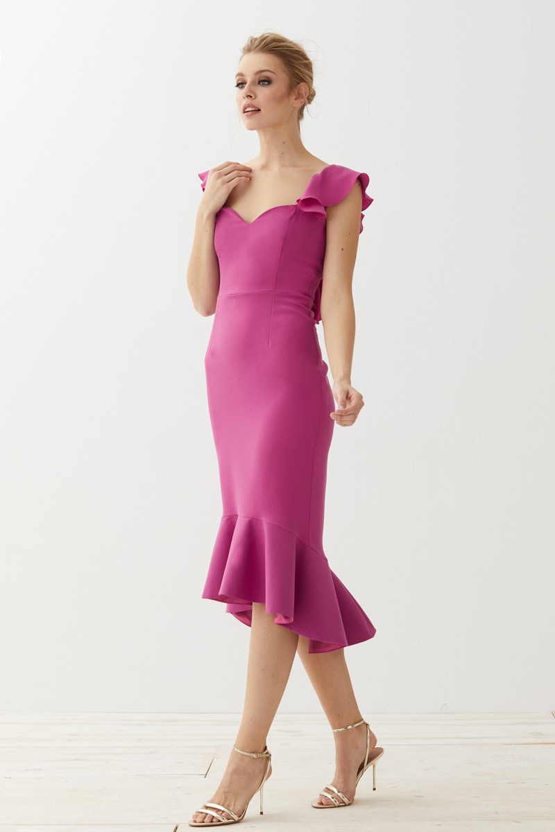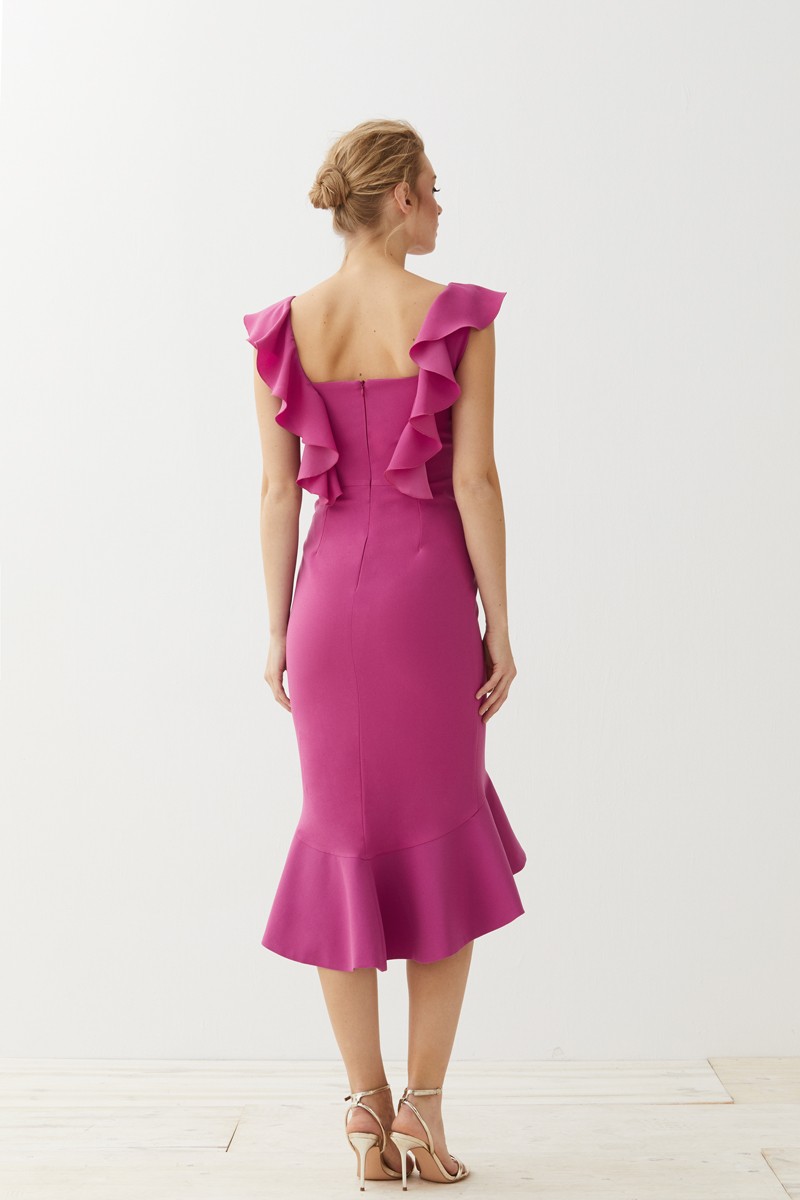 Espectacular vestido corto de fiesta confeccionado en crepe rosa fucsia de excelente calidad. Tirantes anchos y escote corazón. Destaca un bonito volante que cae sobre el hombro y por (...)