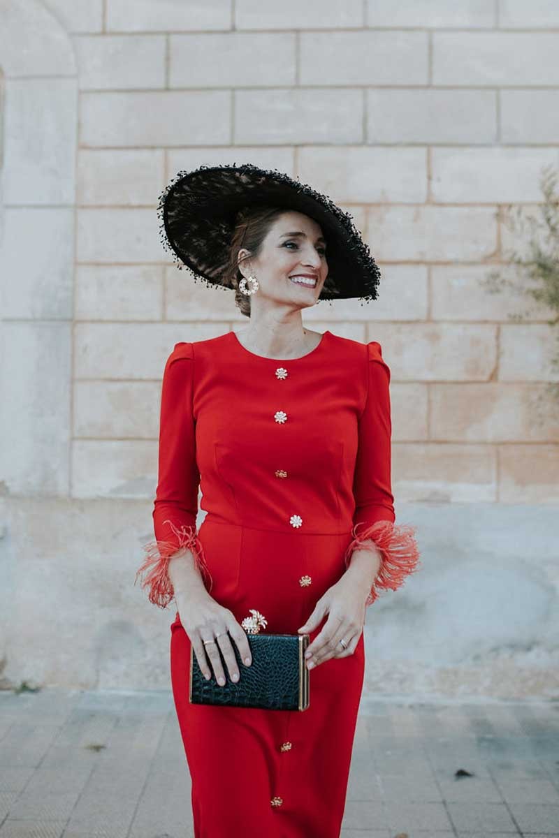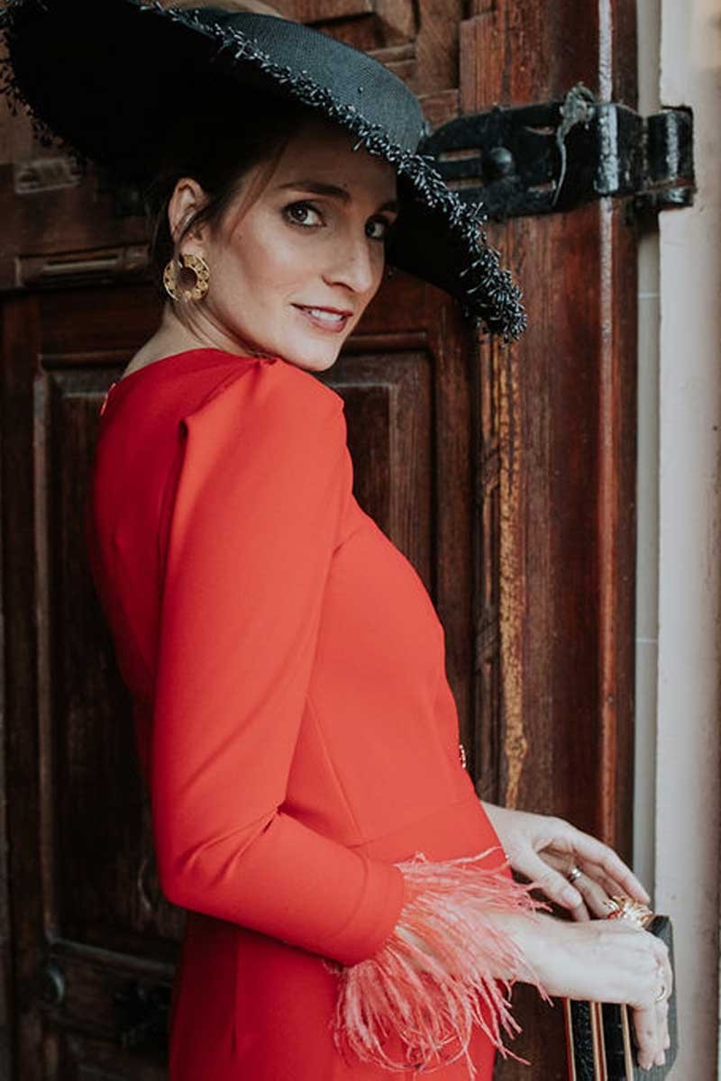 Elegante vestido midi en color rojo con manga francesa con plumas.