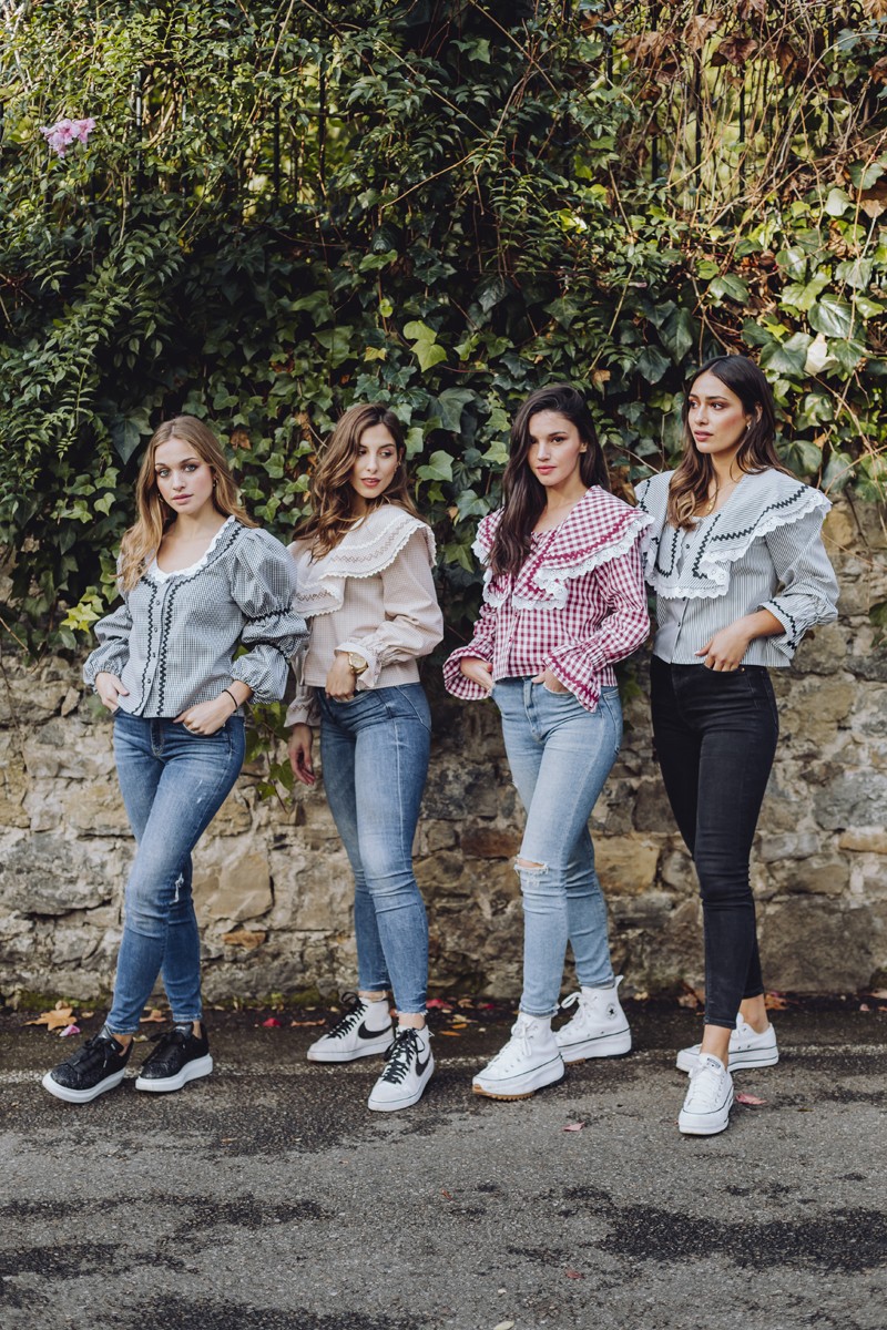 Preciosa blusa confeccionada en popelin de cuadro vichy en color blanco y beige, con botones, cuello abierto y gran cuello con volante adornado con tripa de pollo beige y puntilla blanca. (...)