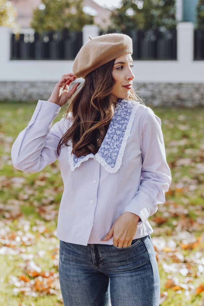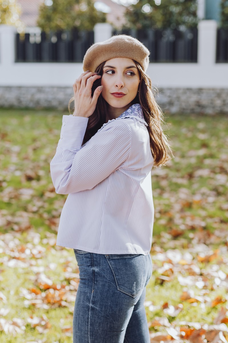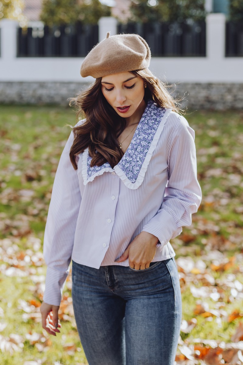 Blusa confeccionada en popelín de rayas lila y blanco con grandes cuellos en pico en contraste en tejido estampado de flores lilas rematados con mini volantito blanco. (...)
