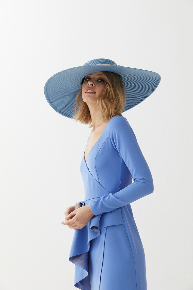Preciosa pamela de rafia azul claro con cintas de color crema y flores de terciopelo blancas. (...)