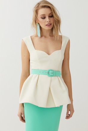 Espectacular conjunto formado por falda lápiz de largo midi en crepe aguamarina y top con escote corazón, tirante ancho y péplum en crepe blanco roto. La falda tiene una pequeña abertura en la parte de atrás para poder caminar y tener movimiento. El top tiene un escote en la recto a la esplada justo a la altura de la tira del sujetador, por lo que se podría llevar un sujetador normal de tirantes.