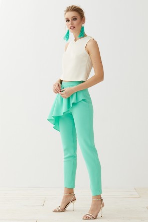 Pantalón pitillo confeccionado en tejido de crepe de color aguamarina. Ceñido en la cintura, estiliza la figura femenina y con peplum asimétrico muy favorecedor. Cierre en el lateral con cremallera al tono y botón forrado.