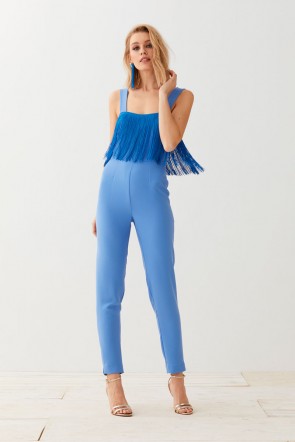 Espectacular mono de fiesta pitillo confeccionado en crepe de color azul con flecos. ¡Perfecto para acudir a una comunión!