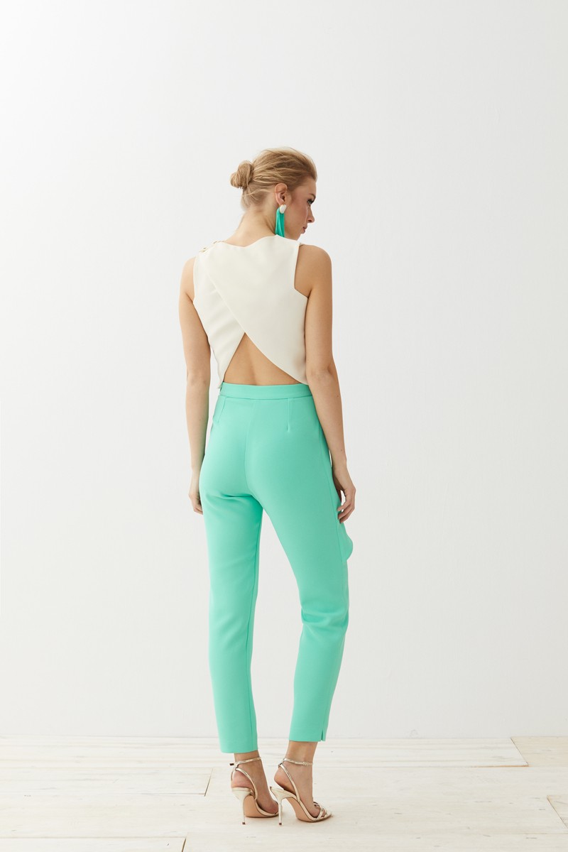 Pantalón pitillo confeccionado en tejido de crepe de color aguamarina. Ceñido en la cintura, estiliza la figura femenina y con peplum asimétrico muy favorecedor. Cierre en el (...)
