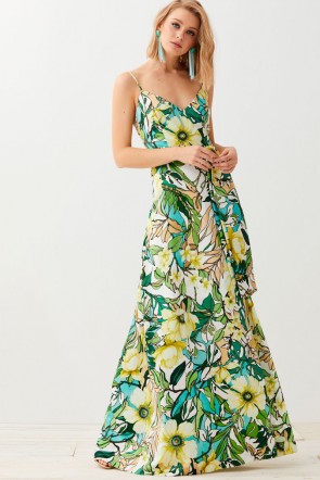 Lleva un precioso adorno de flores realizadas en el propio tejido a lo largo los tirantes. Escote en pico.