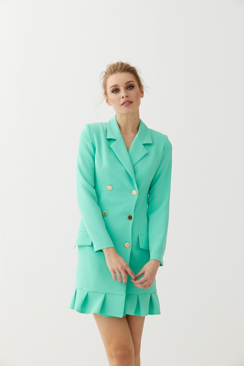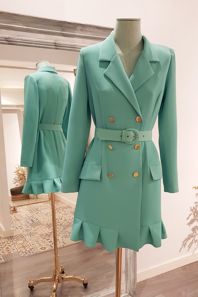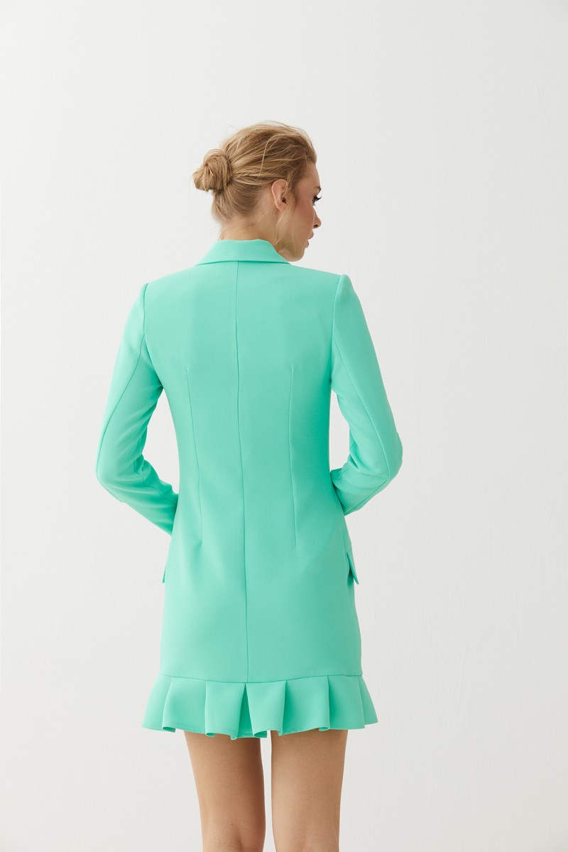 Vestido corto tipo esmoquin confeccionado en tejido de crepe de alta calidad en color aguamarina. Corte entallado que estiliza y favorece la figura femenina. Un precioso vestido, que destaca por su forma de chaqueta americana con el escote en pico y cuello con solapa de manga larga y un volante al final de la falda a la altura de la cadera, que le otorga un bello moviento al caminar.