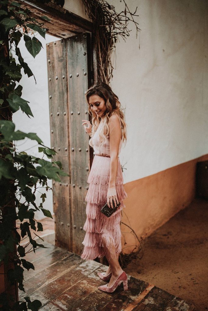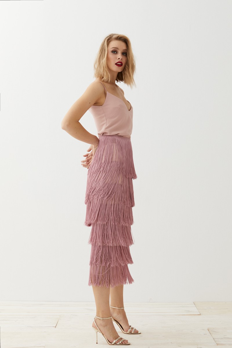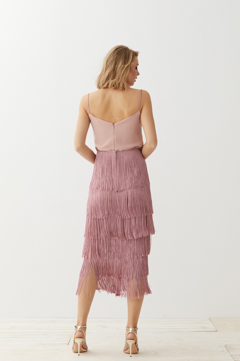 Preciosa Falda de Flecos en color rosa palo de corte midi. Una maravillosa falda entubada cuya base está confeccionada en crepe de color rosa palo y en la que destacan los flecos de (...)