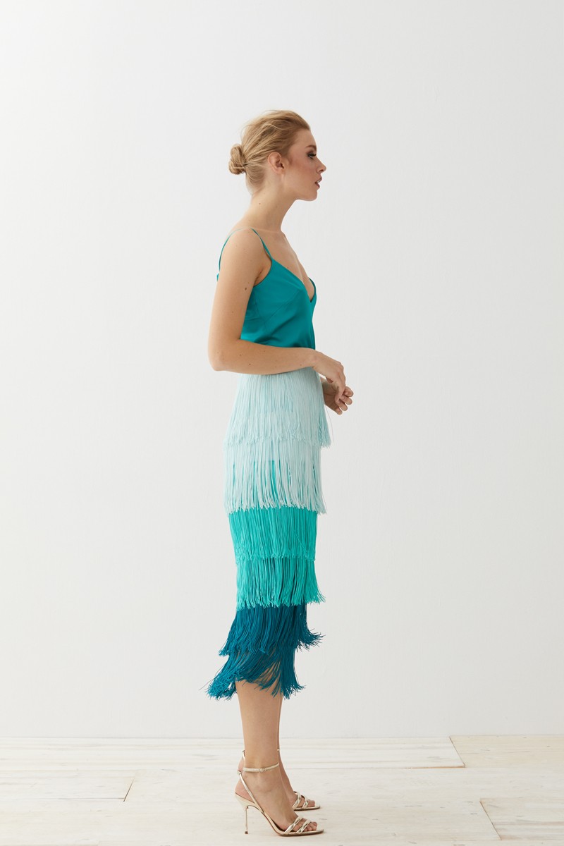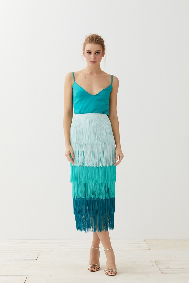 • comprar falda de flecos color aguamarina degradada largo midi de apparentia para invitadas bodas comuniones bautizos de apparentia