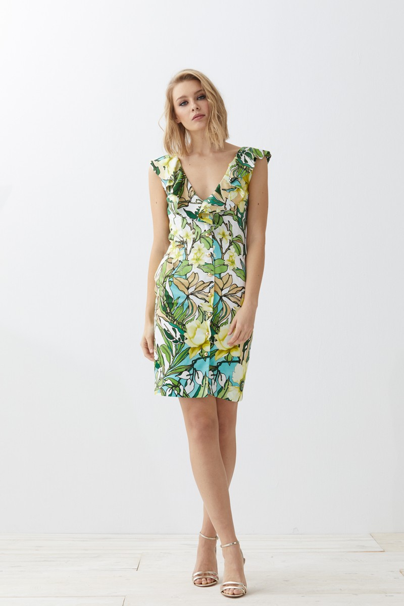 Vestido corto abotonado, con cierre de ocho preciosos botones dorados en la parte delantera y bonito escote en pico por delante y por detrás sobre el que cae un delicado volante tanto en el (...)