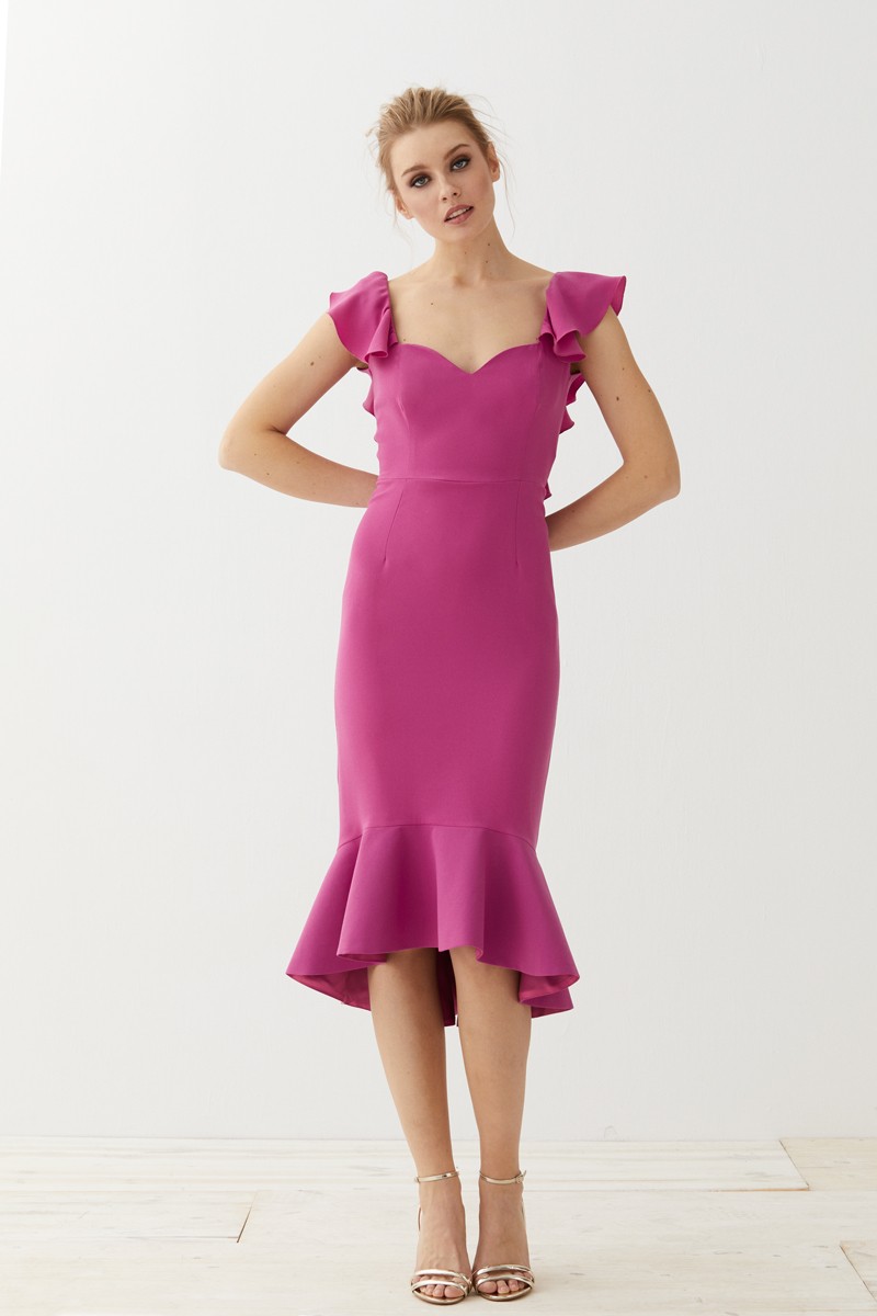 Espectacular vestido corto de fiesta confeccionado en crepe rosa fucsia de excelente calidad. Tirantes anchos y escote corazón. Destaca un bonito volante que cae sobre el hombro y por (...)