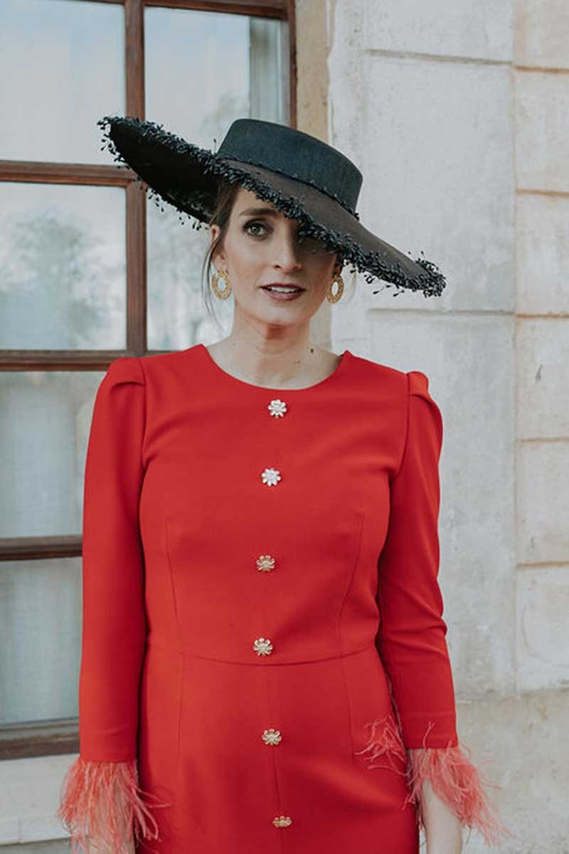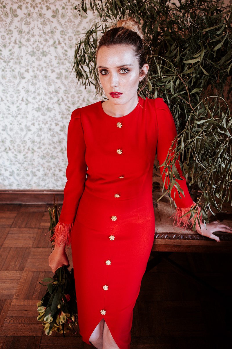 El vestido tiene cuerpo con escote a la caja, y la espalda va cerrada con cremallera. Manga francesa en la que destacan suaves plumas de avestruz (sintéticas) de alta calidad en tono rojo-coral. Además está adornado con botones dorados en forma de margarita. El cuerpo está forrado por dentro.