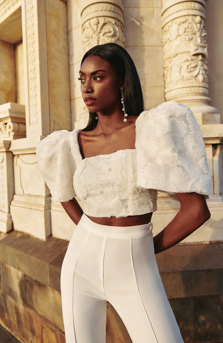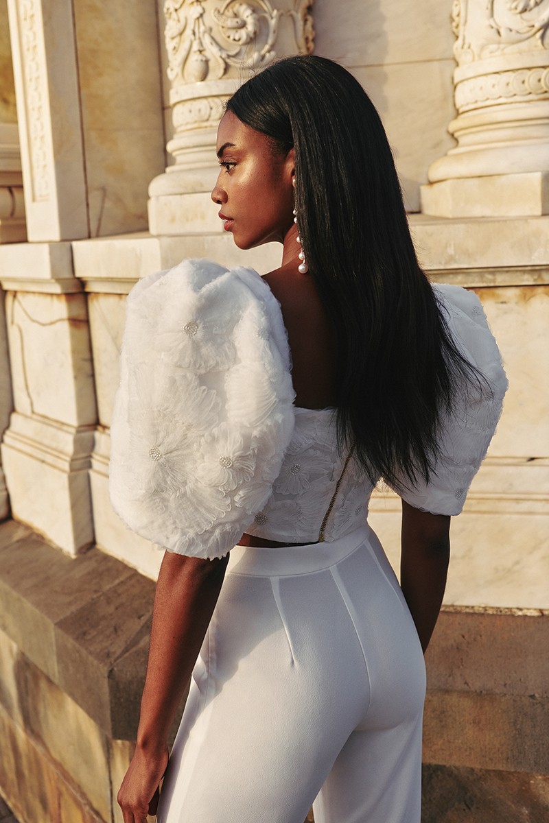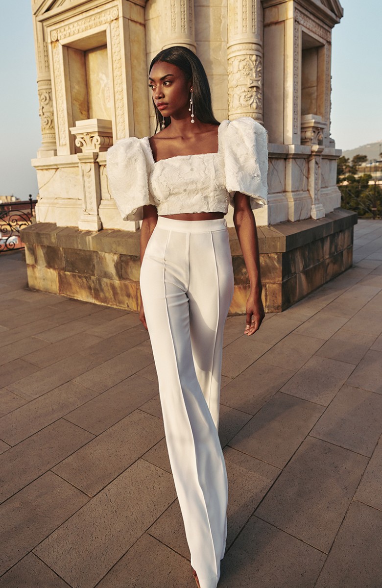 Espectacular conjunto de novia compuesto por pantalón de crepe y top en tul fantasía. (...)