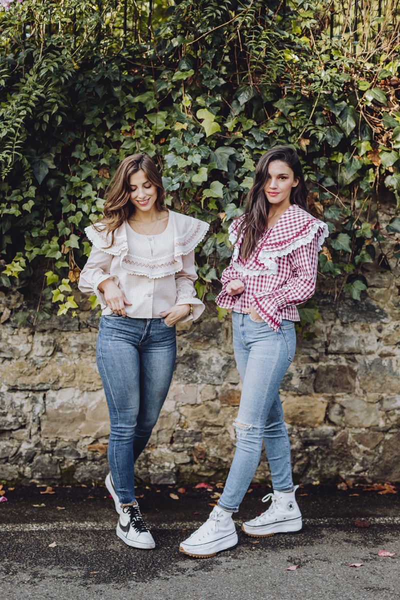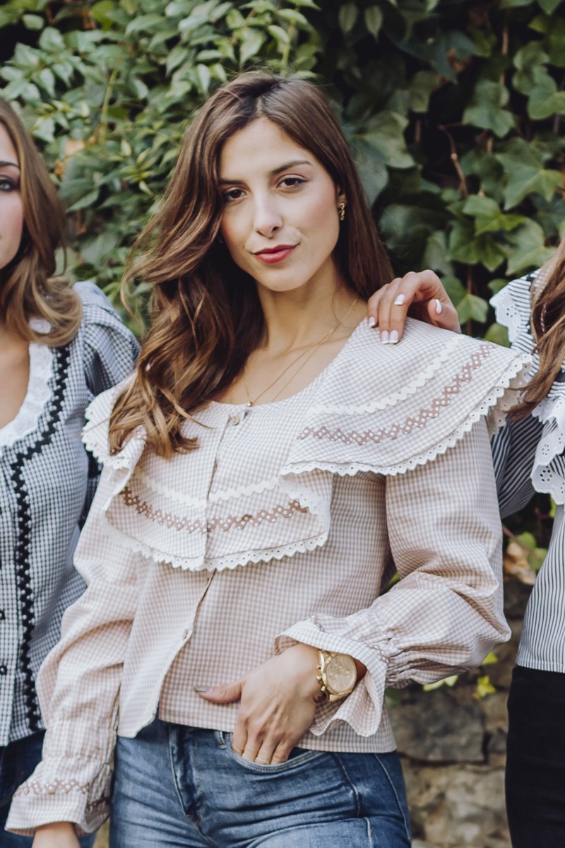 Preciosa blusa confeccionada en popelin de cuadro vichy en color blanco y beige, con botones, cuello abierto y gran cuello con volante adornado con tripa de pollo beige y puntilla blanca. (...)